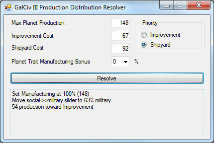 Here's a contrast in styles. Suppose your homeworld is doing the default thing of 1/3 population to each of bc/rp/mp, and your Govern manuf slider is at the default 50% (half social, half military). You have 1 hex, 1 ship, and 1 research project all under construction at the same time. Each of the 3 says it will be done in "(3)" turns. You have a choice: